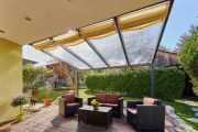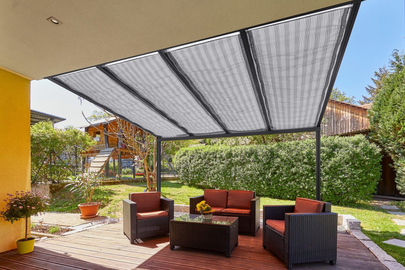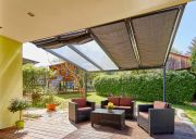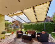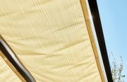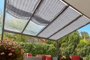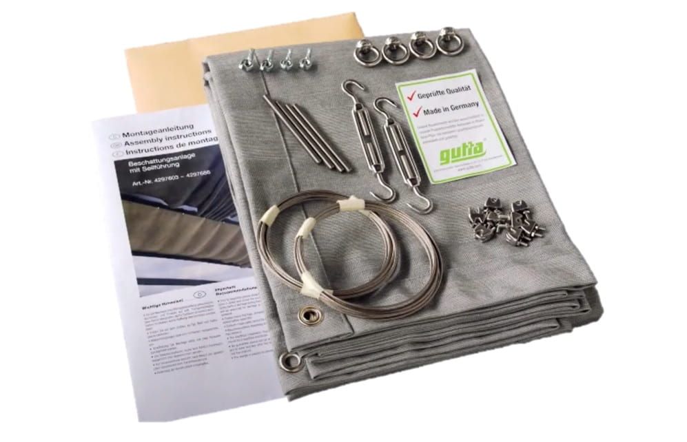 Trwałe rozwiązanie zacieniające na Twój taras, wykonana jest z wysokiej jakości tkaniny akrylowej. Przeznaczona jest do zadaszeń Gutta: 4,00 x 4,00 m; w tym przypadku 945 mm obejmuje 1 panel z poliwęglanu. Montowana jest na stalowych linkach, a naciąg zapewniają śruby rzymskie. Występuje w 4 wariantach kolorystycznych.